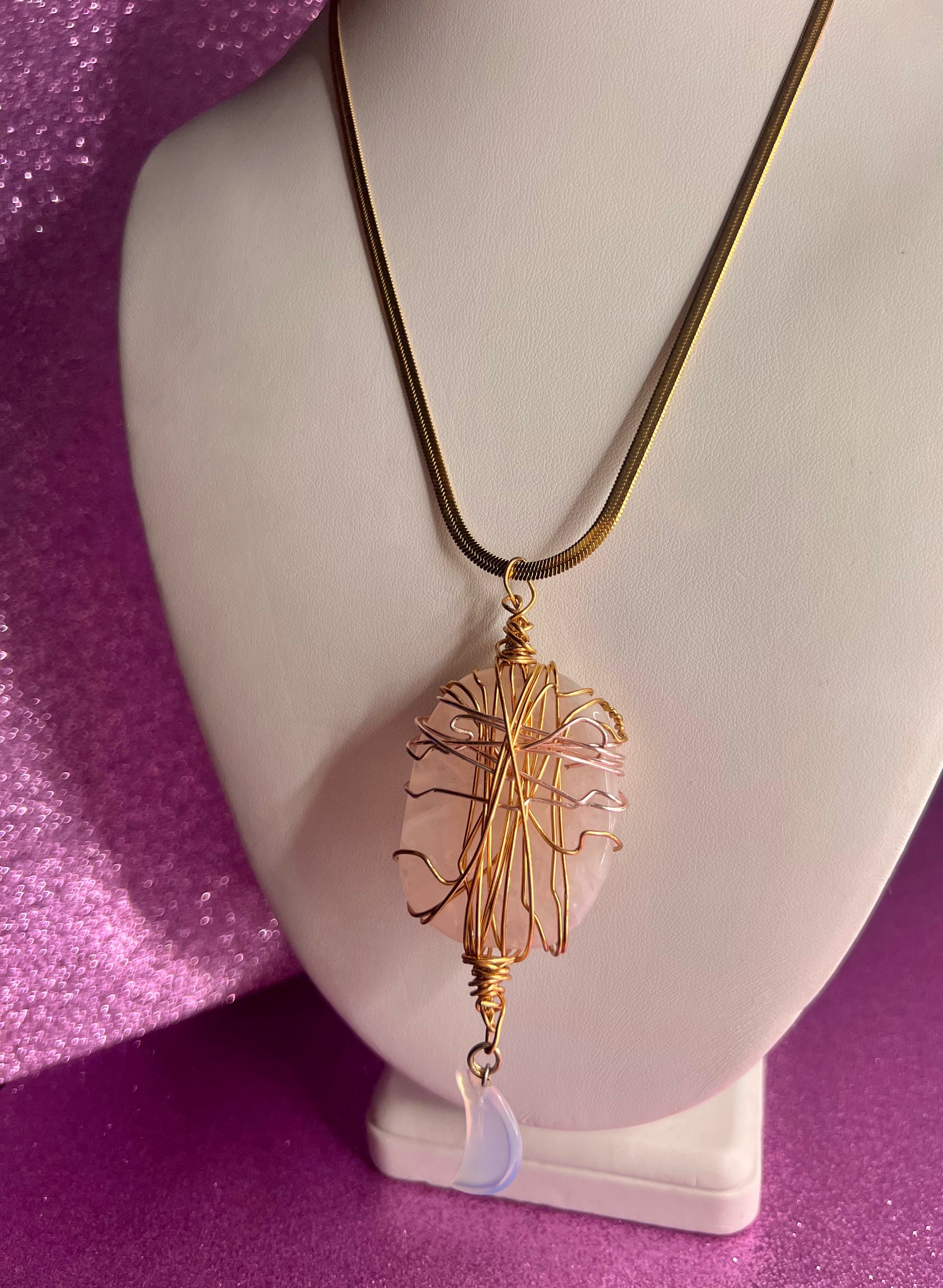 A high frequency piece. A warm, romantic rose quartz crystal strategically wrapped in tarnish free rose gold and gold wire so that it is made to last and remind you of your own magic. Sulk in the moonlight, manifest serenity in crystal divinity. 🌙